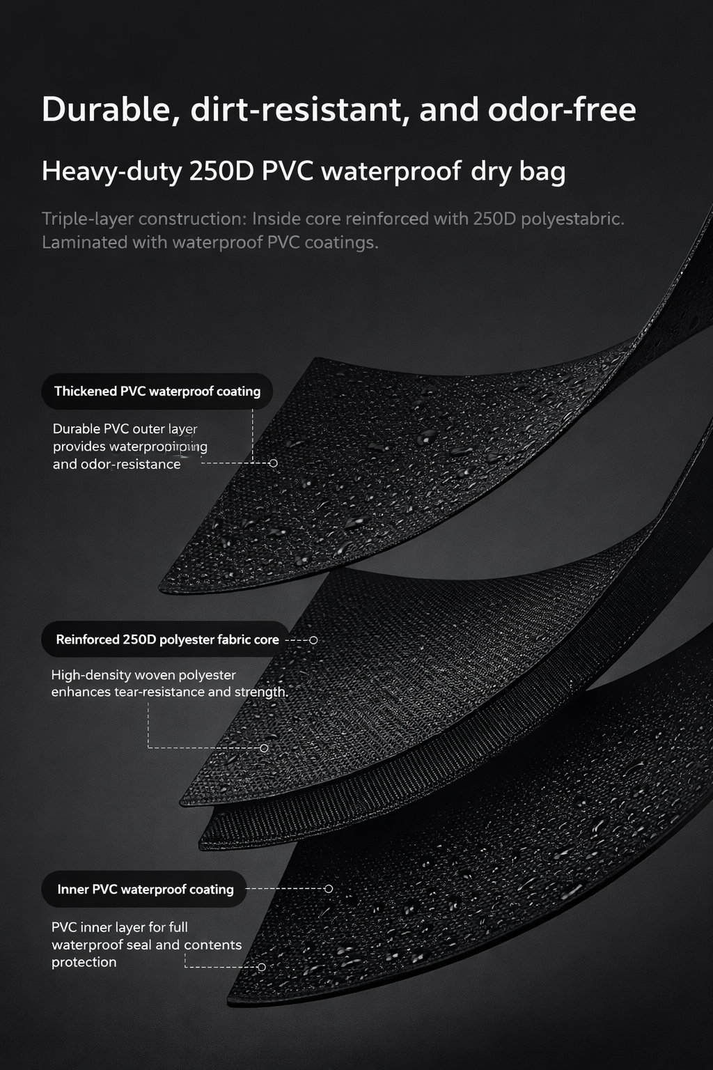 Multiple layers work together to block moisture, resist abrasion, and maintain flexibility — so the bag performs without feeling stiff or bulky.